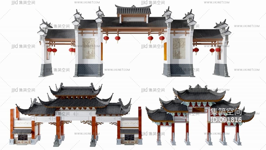 式庭院门入户门门头屋檐3,灯笼大门,抱鼓,d模型3d模型下载