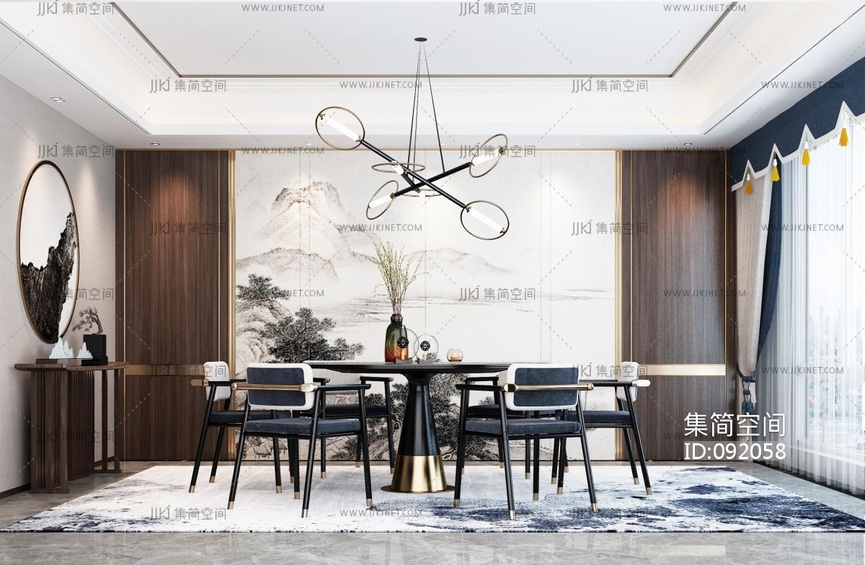 新中式餐厅,餐桌椅,窗帘 3d模型下载 [模型ID:92058]