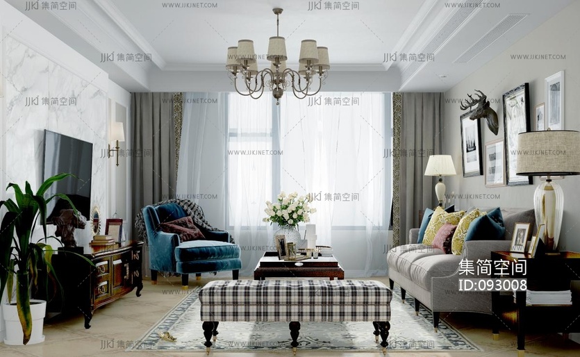 中古风客厅,美式客厅,圆形茶几,装饰画,移动电视,3d模型下载