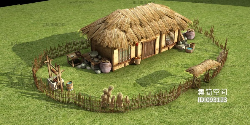 中式房子茅草屋,农场农家院,木栅栏,灶台水井,水桶 3d模型下载 [模型ID:93123]