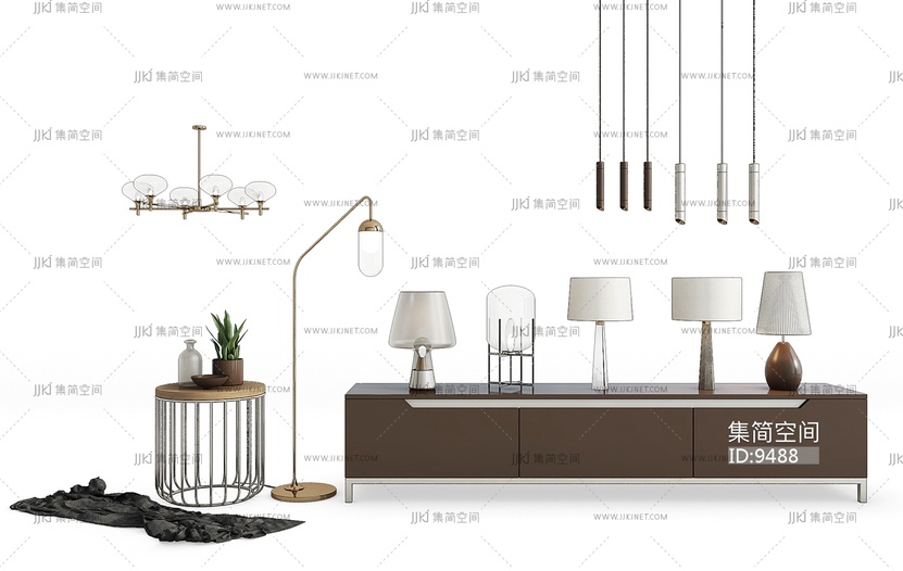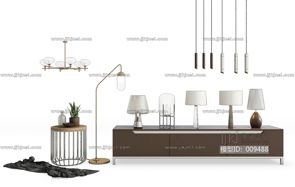 H17-0913现代实木电视柜圆几台灯吊灯组合 3d模型下载 [模型ID:9488]