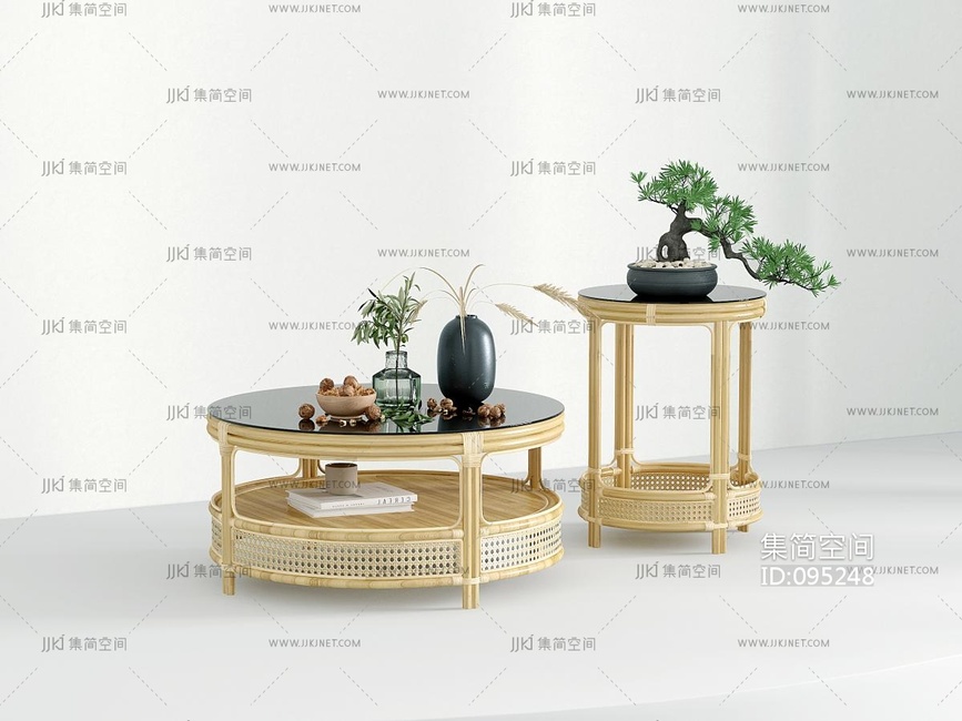 新中式圆形藤编茶几边几组合 3d模型下载 [模型ID:95248]