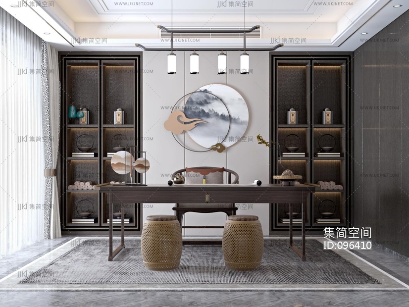 现代书房 书桌椅 壁柜 挂画 吊灯 书 盆栽 摆件3d模型下载