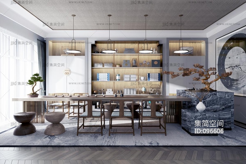 现代书房 书桌椅 壁柜 挂画 吊灯 书 盆栽 摆件3d模型下载