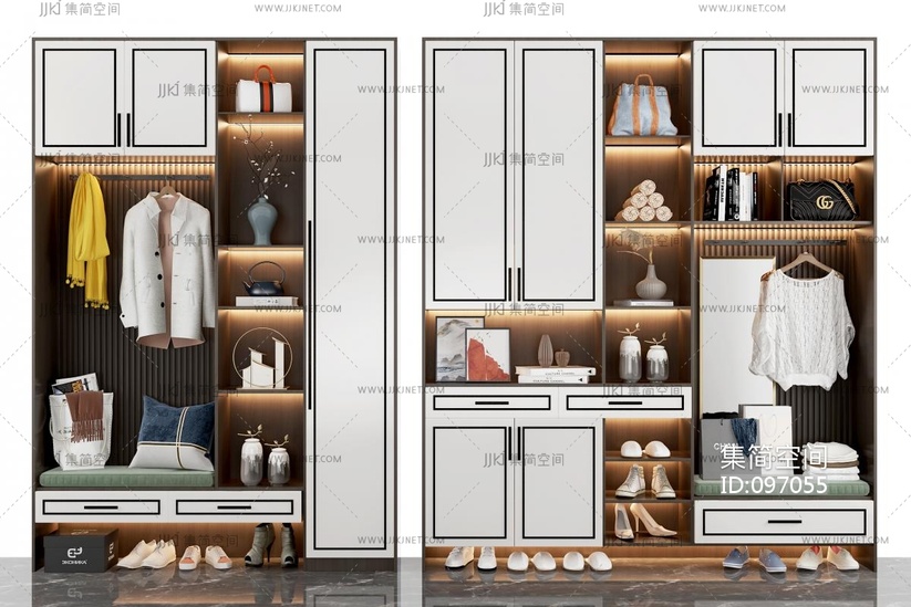 新中式入户鞋柜,衣物,包包,饰品摆件, 3d模型下载 [模型ID:97055]