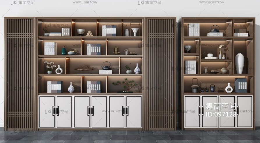 新中式实木书柜, 3d模型下载 [模型ID:97128]