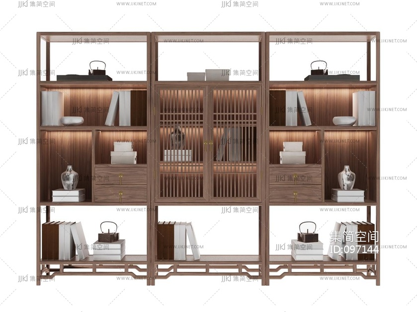 新中式实木书柜,书籍,饰品摆件 3d模型下载 [模型ID:97144]