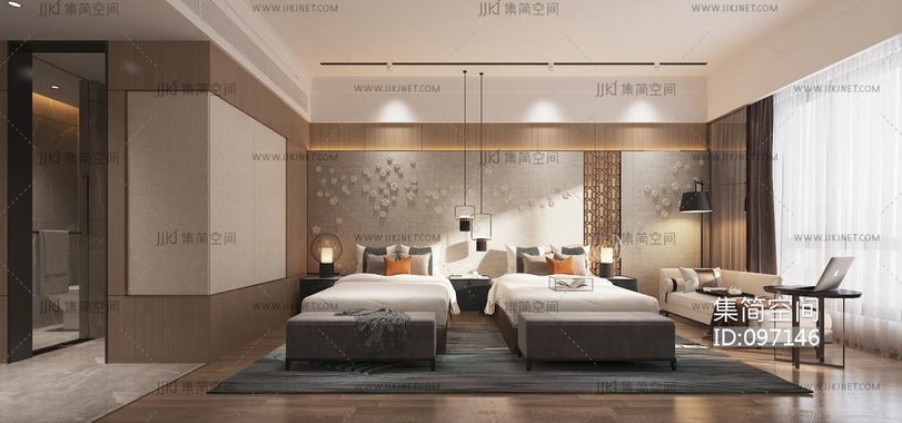 现代酒店双人床客房 3d模型下载 [模型ID:97146]