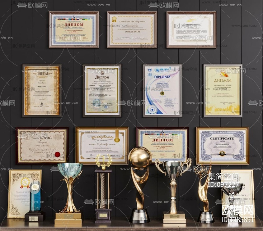 现代奖状,奖牌,奖杯荣誉证书,荣誉墙3d模型下载