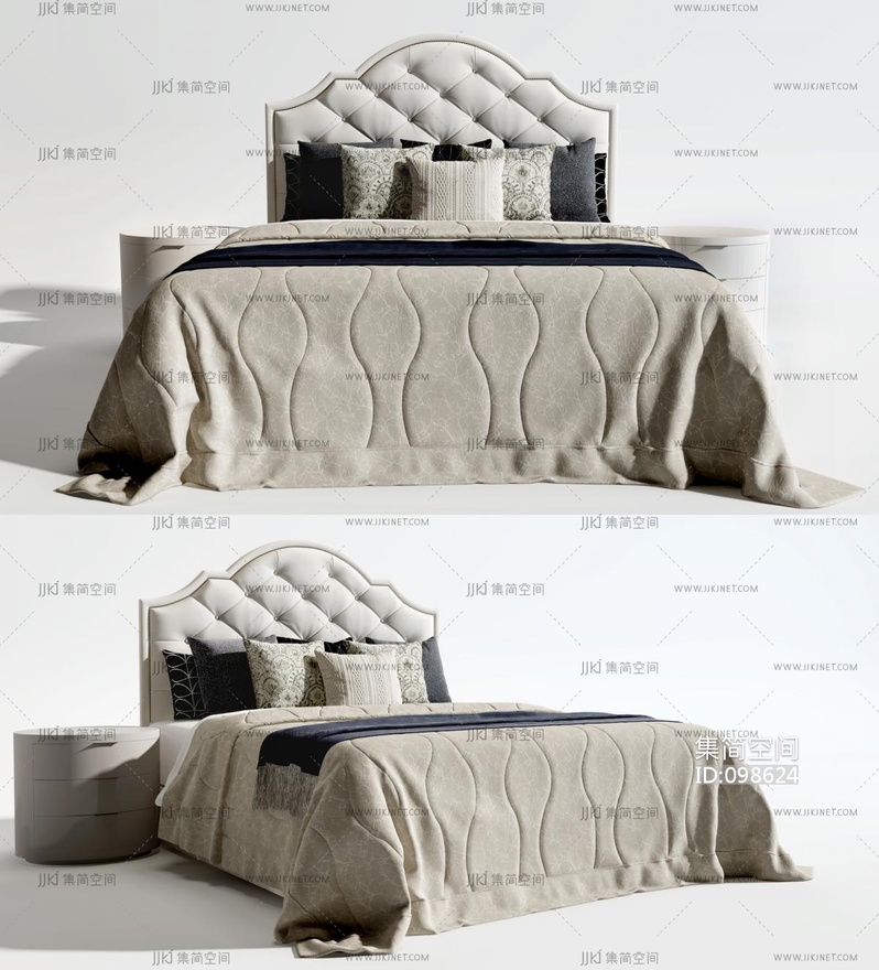 简欧式布艺双人床,床头柜组合 3d模型下载 [模型ID:98624]
