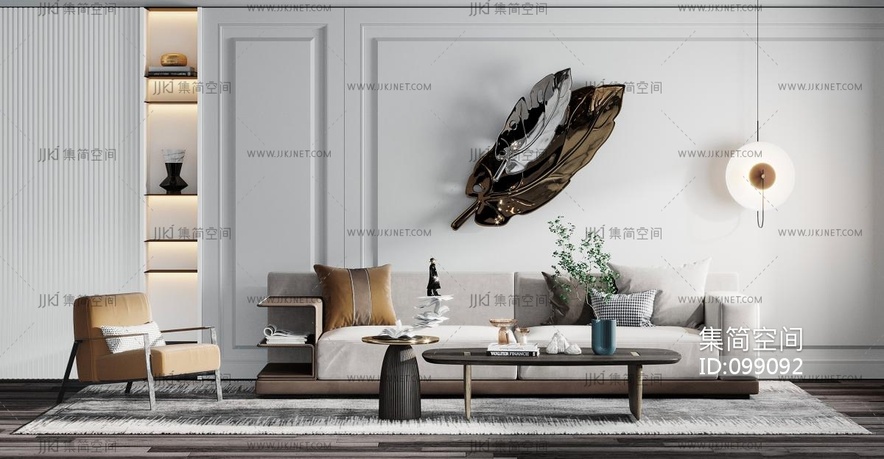 现代沙发茶几组合,单人椅子,树叶挂饰挂件 3d模型下载 [模型ID:99092]