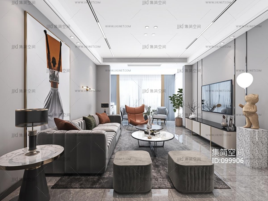 中古风客厅,美式客厅,圆形茶几,装饰画,移动电视,3d模型下载