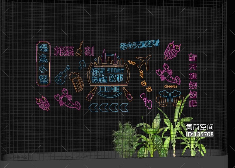 现代烧烤店霓虹灯,装饰灯SU模型 su草图模型下载 [模型ID:135708]