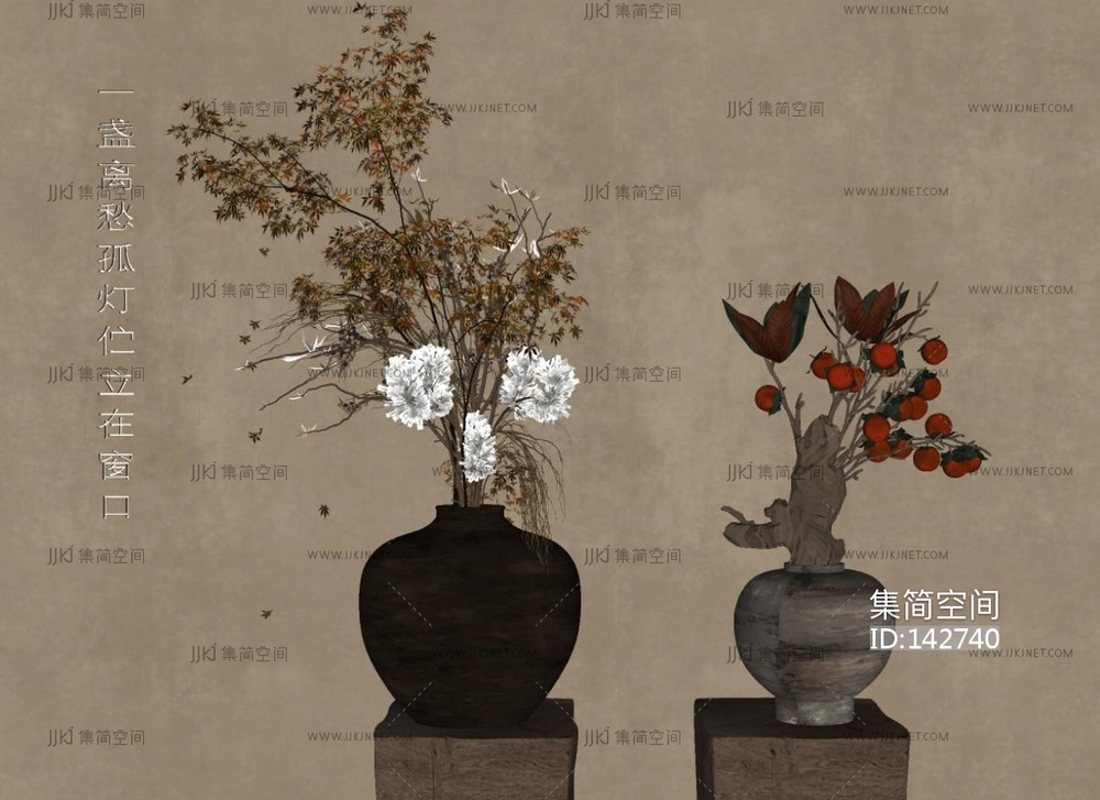 新中式中古花艺,陶罐花瓶SU模型su草图模型下载