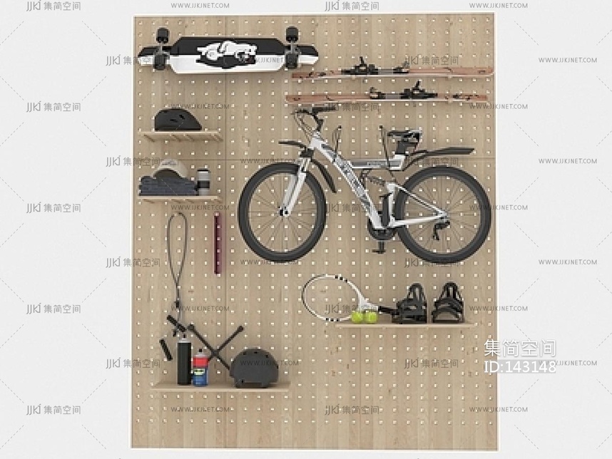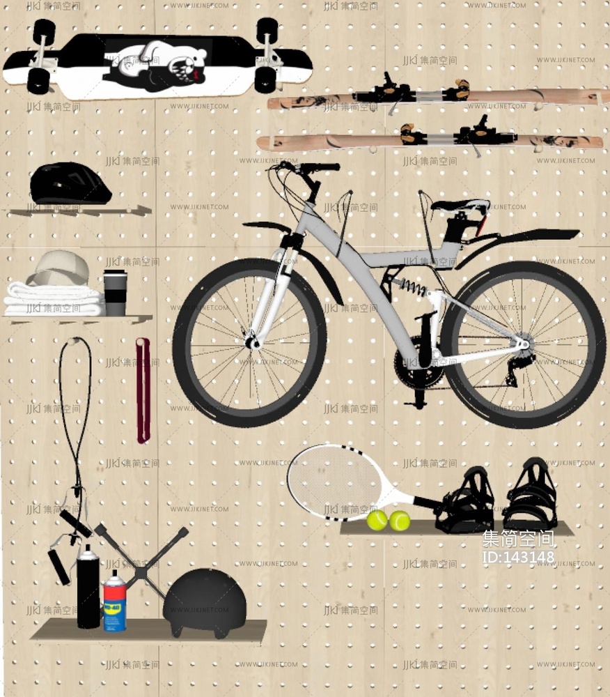 运动器材组合,_滑板_滑雪板,山地自行车,头盔,洞洞板SU模型 su草图模型下载 [模型ID:143148]