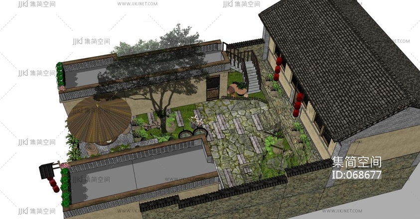 29新中式民宿客栈农村院子民房瓦房遮阳伞 su草图模型下载 [模型ID:68677]