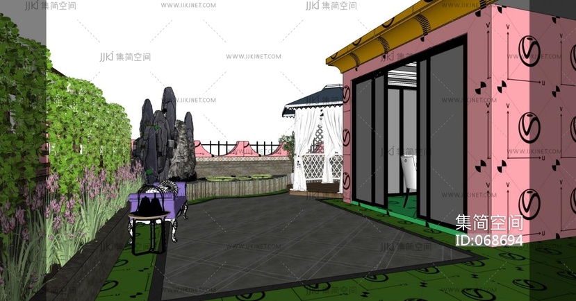 阳台庭院屋顶花园景观假山石头水景户外帐篷遮阳伞欧式贵妃榻卧榻 su草图模型下载 [模型ID:68694]