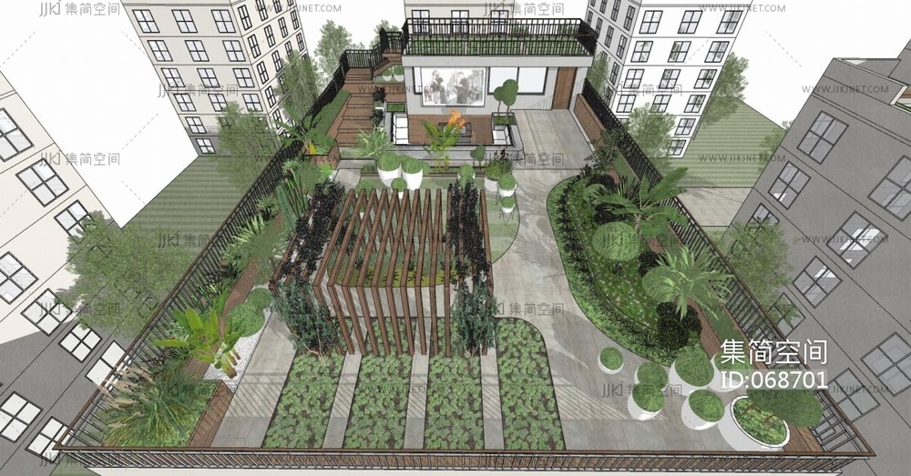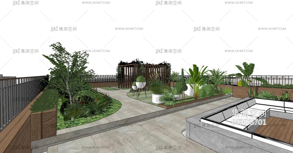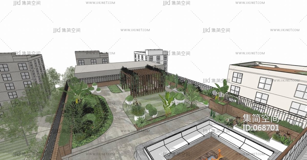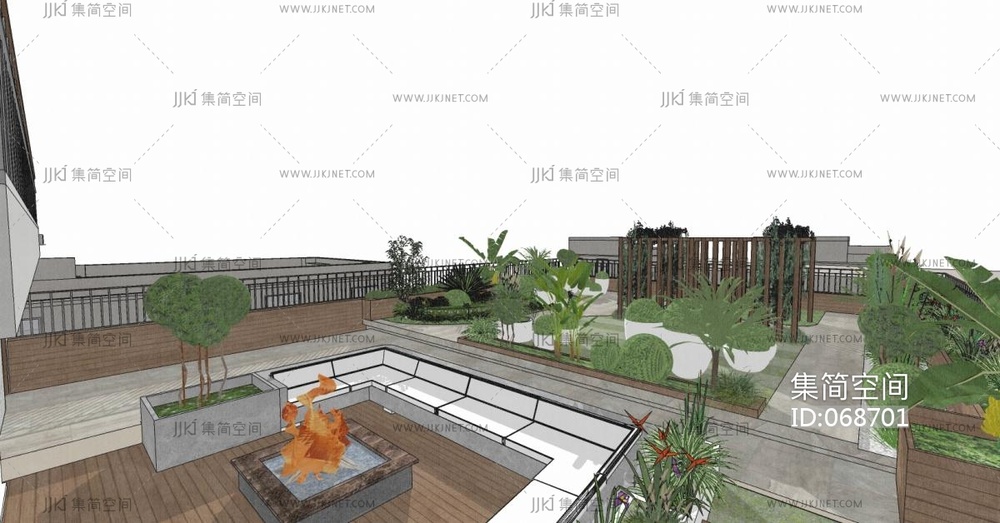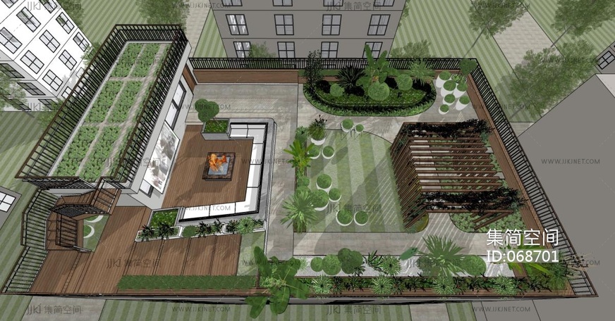 01现代屋顶花园景观庭院景观阳台廊架藤蔓植物景观植物篝火火池盆栽树 su草图模型下载 [模型ID:68701]