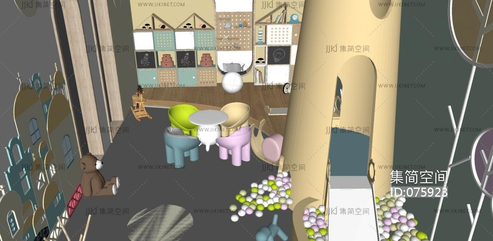 371现代儿童活动区空间,儿童读书阅览室,儿童游乐玩具,儿童玩具装饰摆件,木马凳,儿童图书柜,云朵模型su草图模型下载