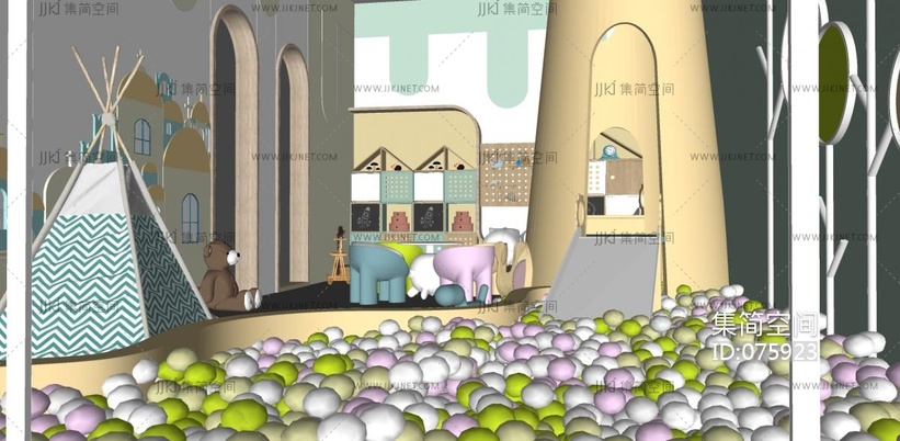 36北欧儿童娱乐空间 帐篷 玩具 儿童沙发椅组合 抱枕 su草图模型下载 [模型ID:75923]