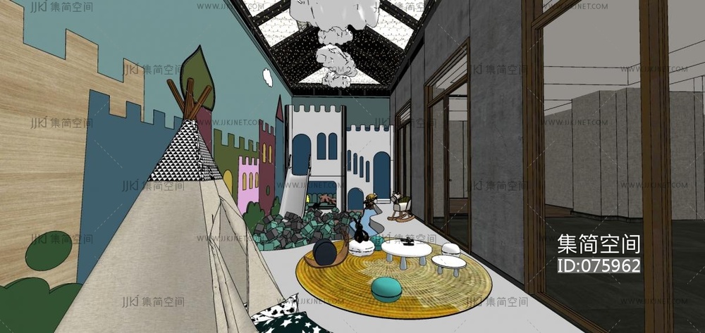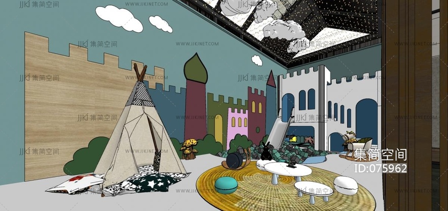 371现代儿童活动区空间,儿童读书阅览室,儿童游乐玩具,儿童玩具装饰摆件,木马凳,儿童图书柜,云朵模型su草图模型下载