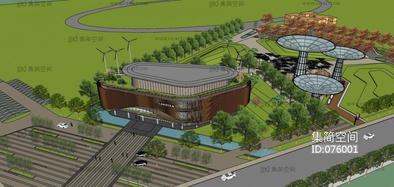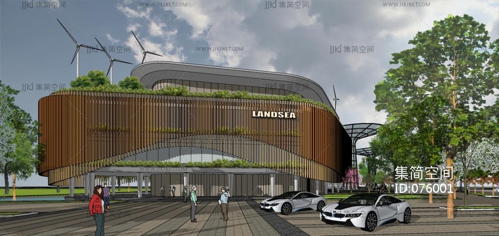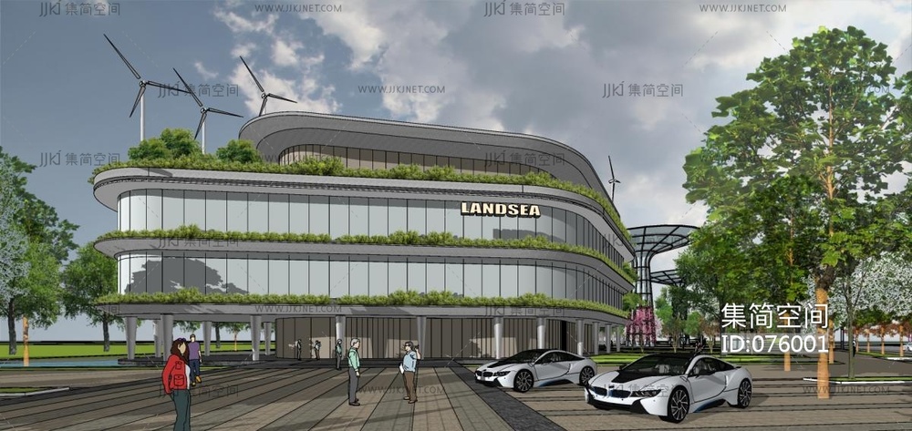 116现代售楼处会所,会所门头立面,景观规划,草地绿植,电力风车 su草图模型下载 [模型ID:76001]