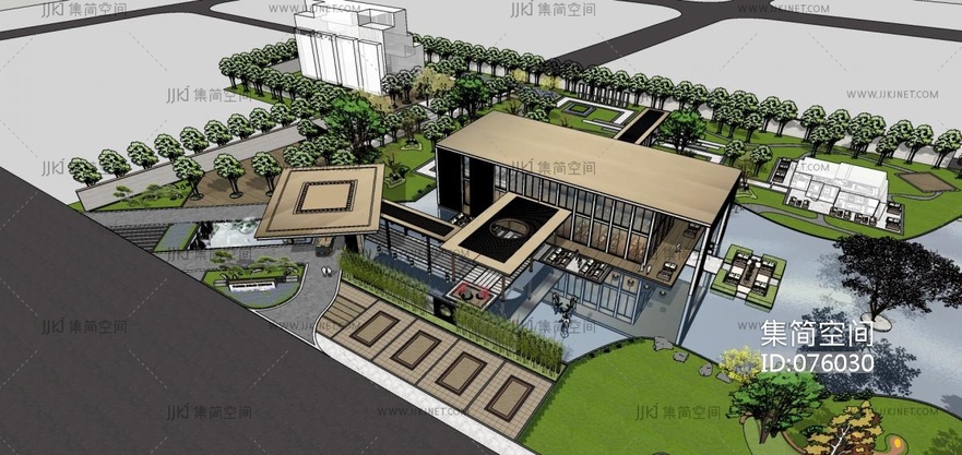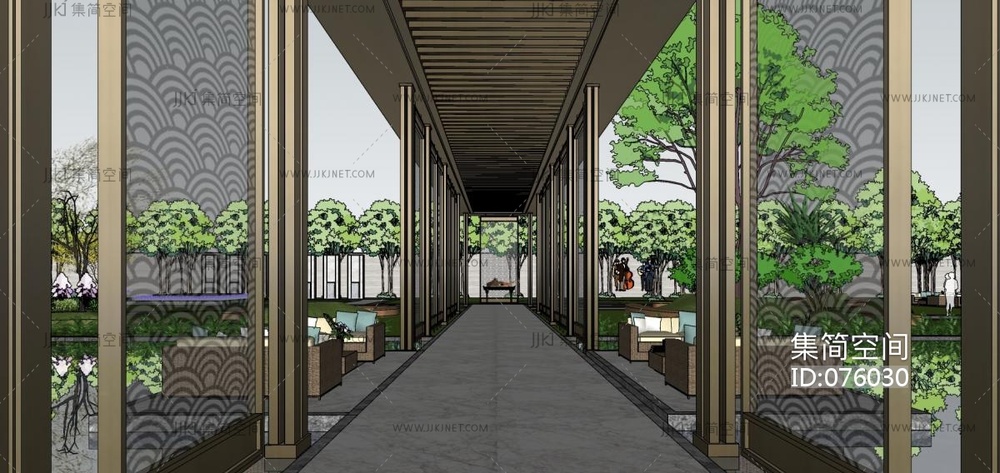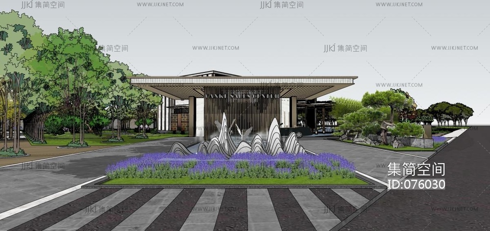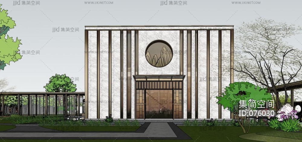 144万科现代新中式风格售楼处,新中式门头立面,新中式连廊,庭院景观,高档会所中心,山形景观 su草图模型下载 [模型ID:76030]