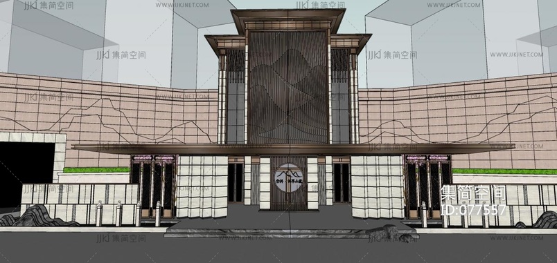 47新中式售楼处会所 售楼处大门 门口景观 新中式会所门头,拴马狮子柱,中式入口景观,商业街区 商业中心 su草图模型下载 [模型ID:77557]