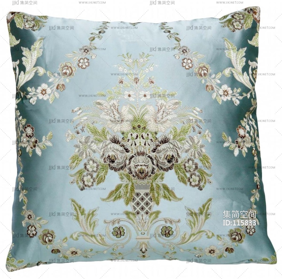 新中式翡翠绿抱枕 绿白拼接珠珠装饰抱枕材质贴图下载
