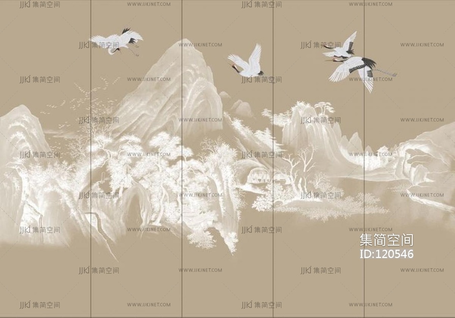 新中式山脉仙鹤壁纸壁布背景画 (10) 材质贴图下载
