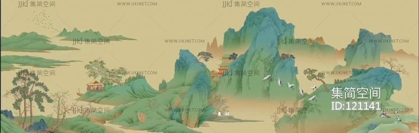 新中式山脉松树彩绘壁纸工笔画- (6)材质贴图下载