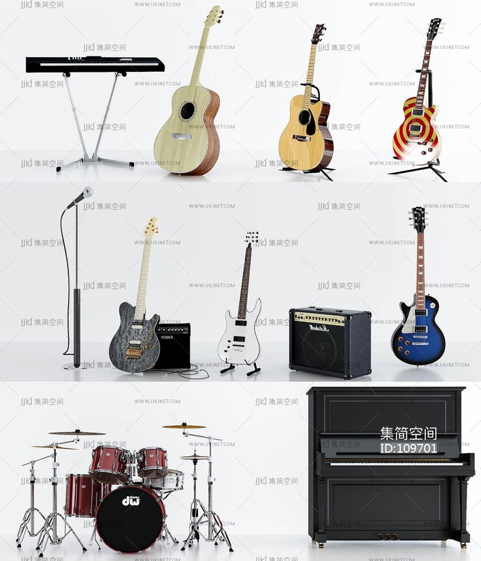 吉他架子鼓钢琴乐器组合 3d模型下载 [模型ID:109701]