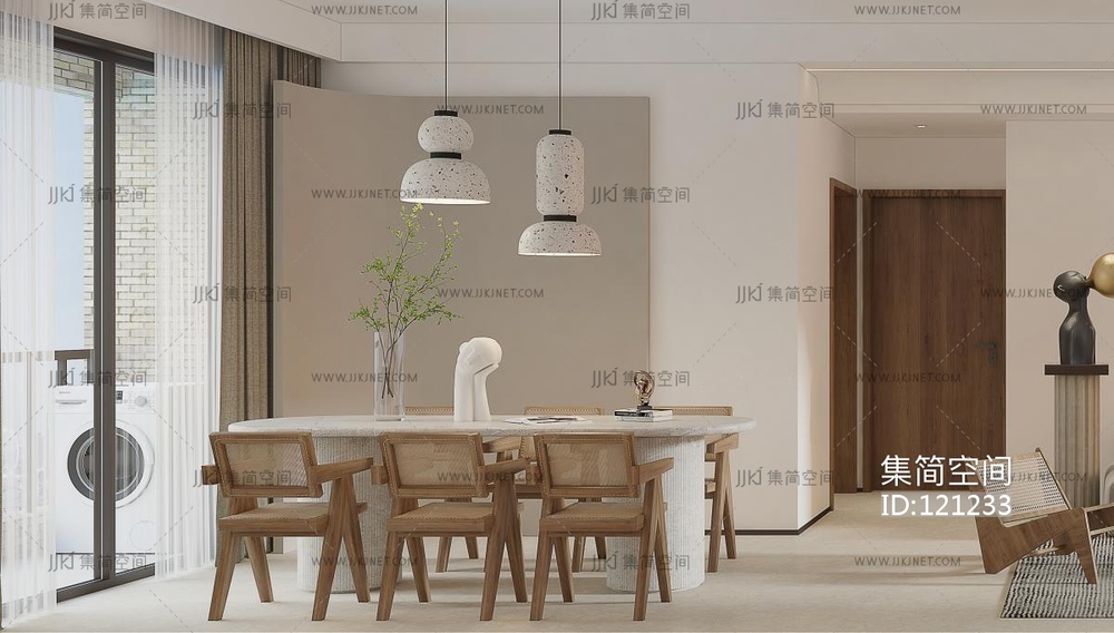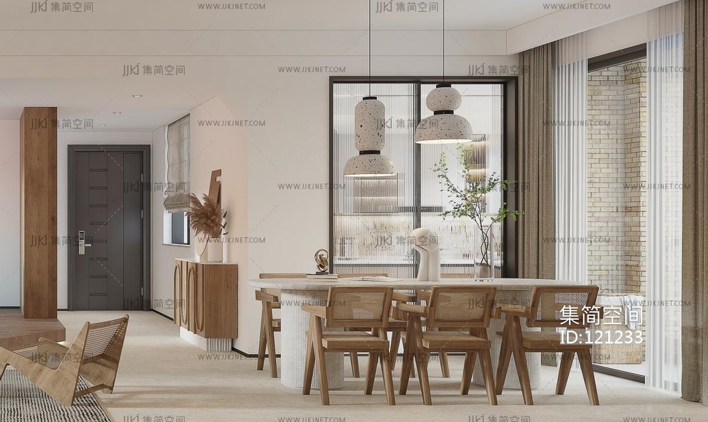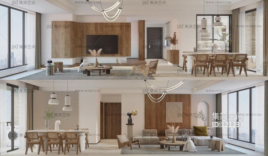 现代客厅餐厅原木餐桌L型沙发 3d模型下载 [模型ID:121233]
