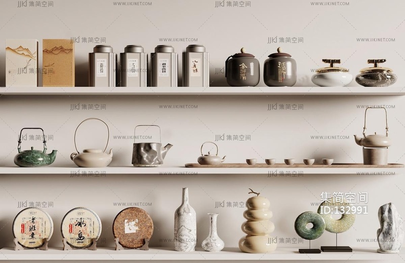 03-新中式茶具_茶叶_茶杯_茶饼_装饰柜_展示柜3D模型3d模型下载