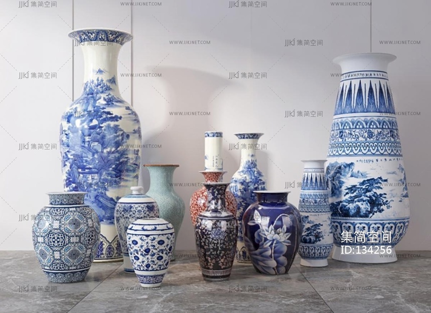 现代罐子_瓷器_陶罐_青花瓷花瓶_瓷器组合3D模型3d模型下载