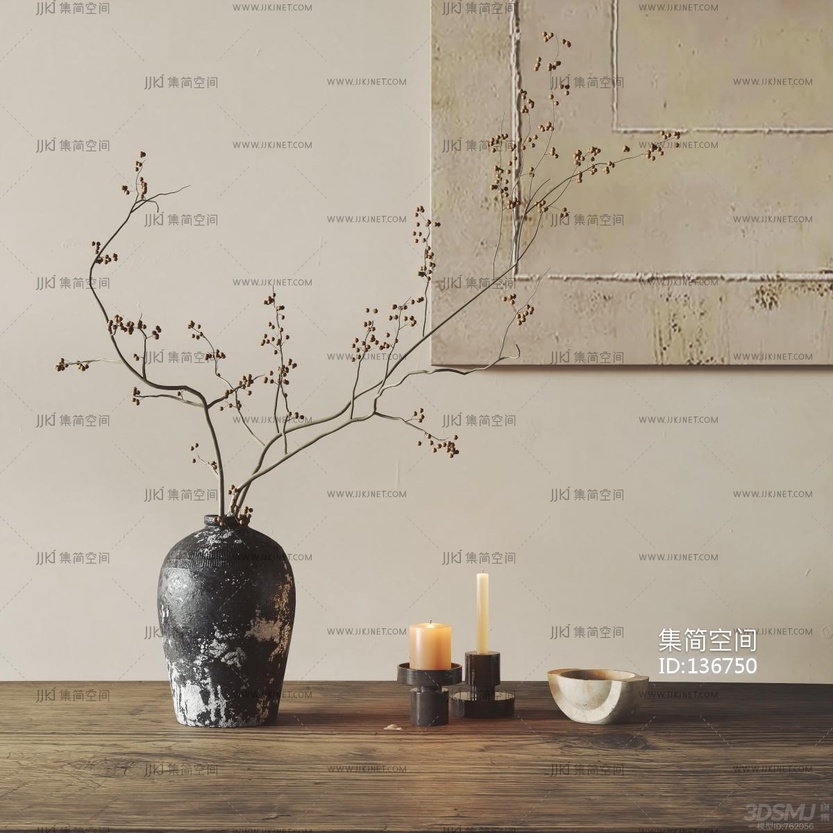 新中式侘寂风干枝 陶罐 花瓶 3d模型下载 [模型ID:136750]