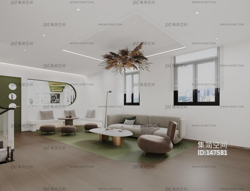 托管教育休闲区 图书馆休息区 花艺吊篮装饰 芦苇枯叶 休闲沙发 凳子 3d模型下载 [模型ID:147581]