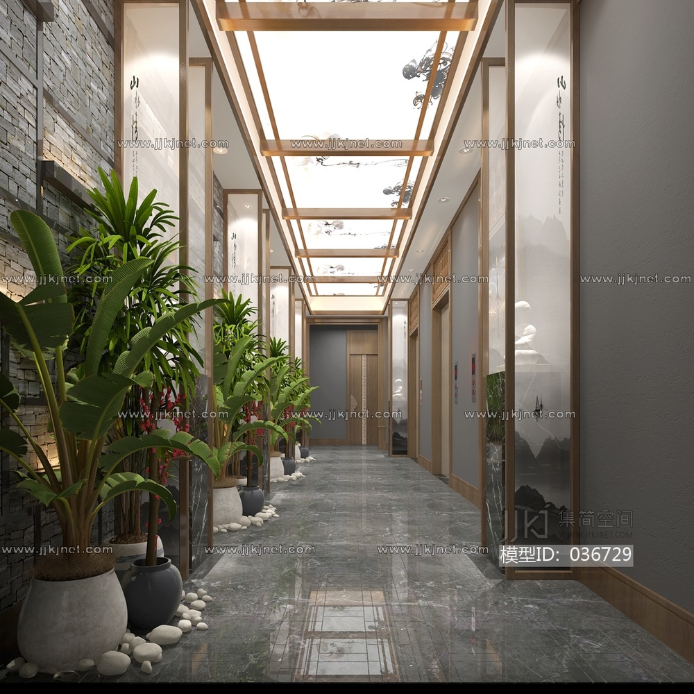 H02-0419新中式餐饮餐厅走廊植物盆栽 3d模型下载 [模型ID:36729]