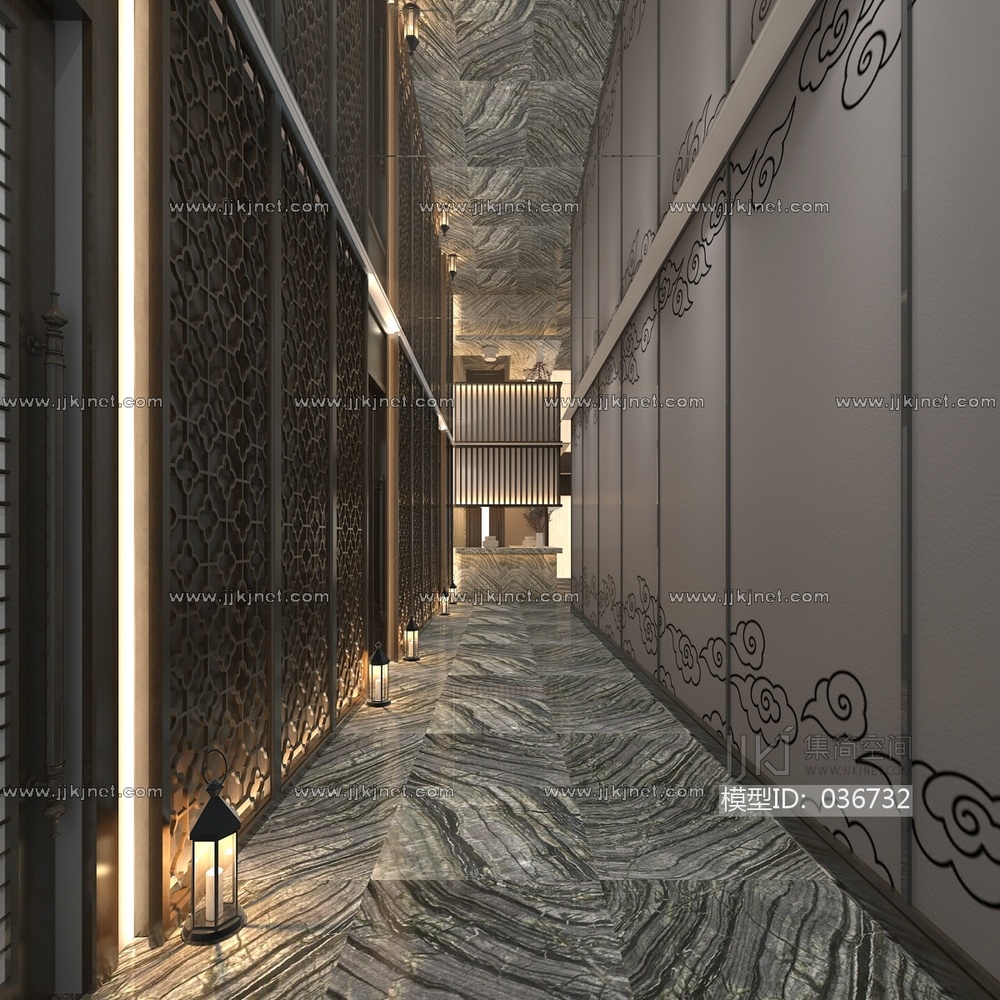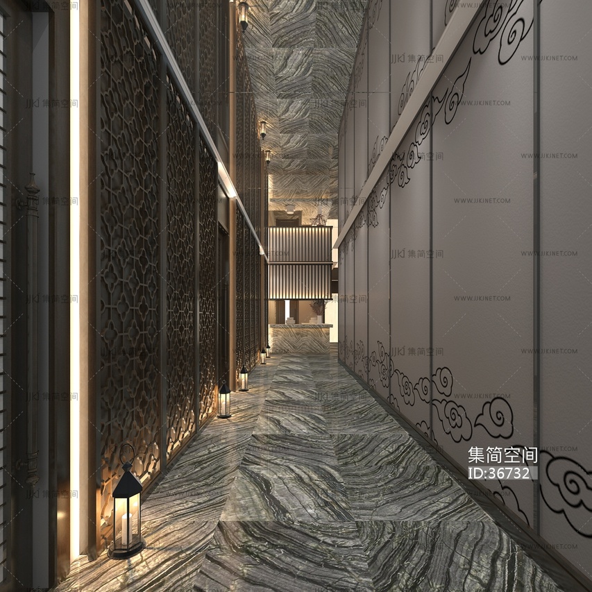 H04-0420新中式餐饮会所茶室酒店走廊3d模型下载