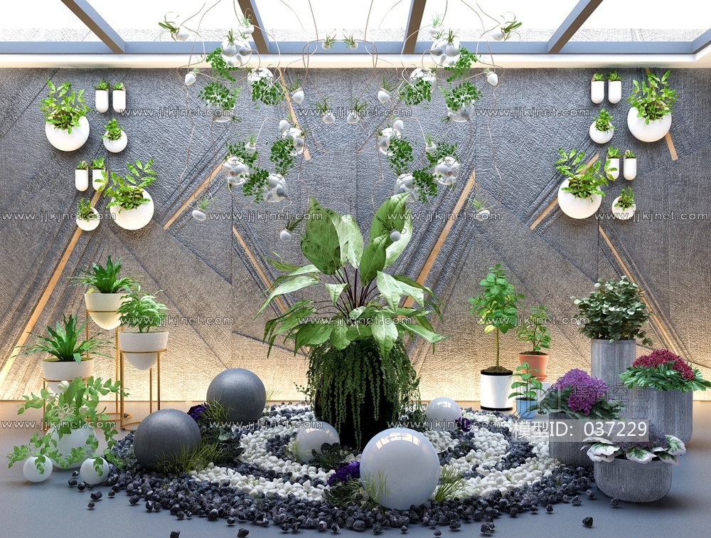 H03-0418盆栽植物吊篮藤蔓吊灯阳光房鹅卵石 3d模型下载 [模型ID:37229]