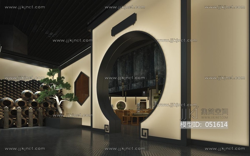 Z04-0702新中式餐厅门头入口酒罐子月亮门迎客松景观 3d模型下载 [模型ID:51614]