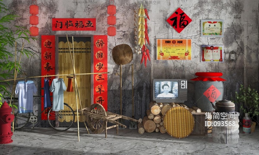 乡村复古电视机推车,衣架农具组合 3d模型下载 [模型ID:93568]