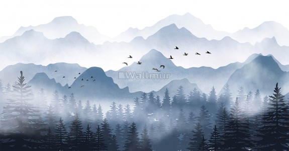 现代新中式山脉树林风景画壁纸背景画 (4)