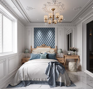 法式主卧室,雕花双人床,床头柜,梳妆台吊灯石膏花,