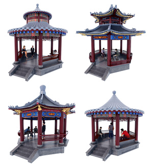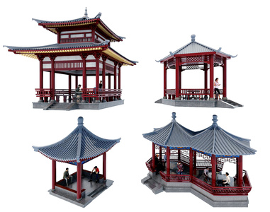09中式古建凉亭,休闲人物,石桌凳,石桌椅水榭斗拱