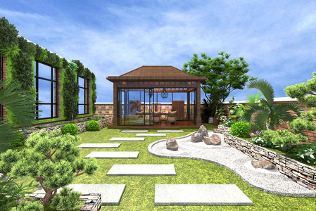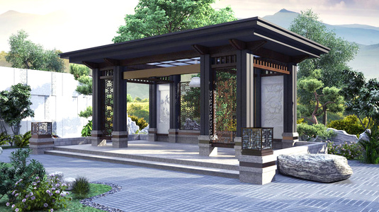 中式凉亭,庭院绿植,景观,石头树,绿植,遮阳棚