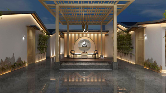 08中式凉亭,庭院,植物,假山,围墙,桌椅