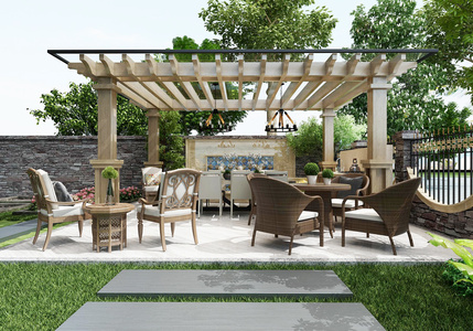 美式欧式景观花园,庭院,凉亭,廊架,植物景观,户外藤编桌椅