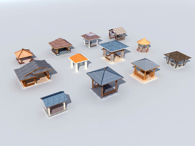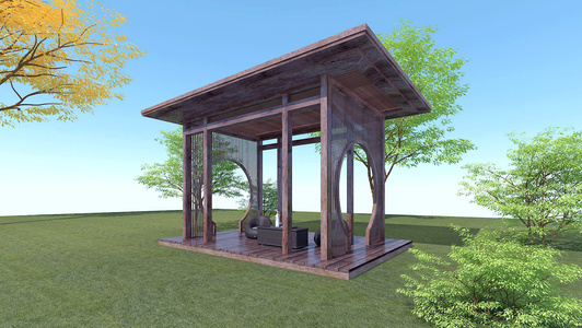 中式景观凉亭,亭子,休闲桌椅,绿植,树,遮阳棚