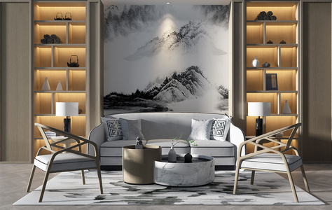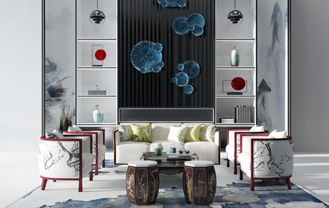 H09-0717新中式沙发单人沙发茶几鼓凳书柜挂饰挂件